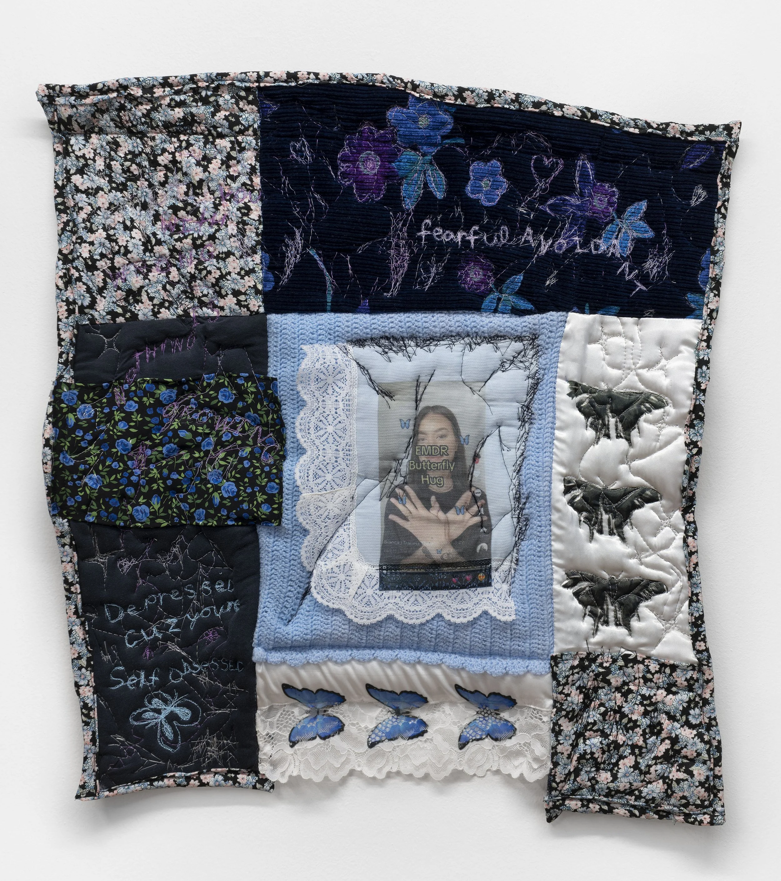 Butterfly Hug Me 202526" x 24"vintage clothes fabric, lace robe, t-shirt, crochet blanket, sublimation print, thread, batting